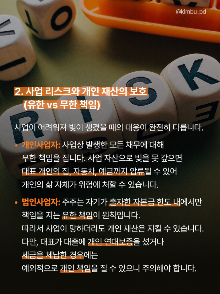 - 개인: 무한 책임입니다. 사업 빚을 못 갚으면 대표의 집, 차, 예금까지 압류됩니다.