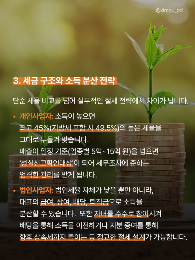 - 개인: 소득이 높으면 최고 **45%(지방세 포함 49.5%)**의 세금을 맞습니다. 또한 ‘성실신고확인대상’이 되면 세무 간섭이 매우 심해집니다.