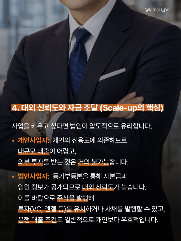 - 금융권 대출: 일반적으로 개인보다 법인이 대출 한도나 금리 조건에서 우호적인 평가를 받습니다.