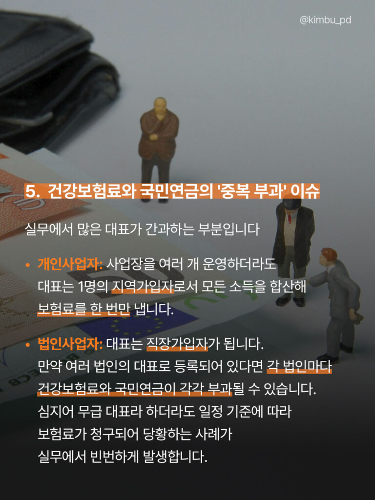 - 건강보험료 중복 부과 이슈: 개인사업자는 사업장이 여러 개여도 건보료를 한 번만 내지만, 법인 대표는 ‘직장가입자’가 됩니다. 여러 법인의 대표를 맡고 있다면 각 법인마다 건보료가 부과될 수 있습니다. 심지어 무급 대표라도 예외 규정에 따라 보험료가 청구될 수 있으니 주의해야 합니다.