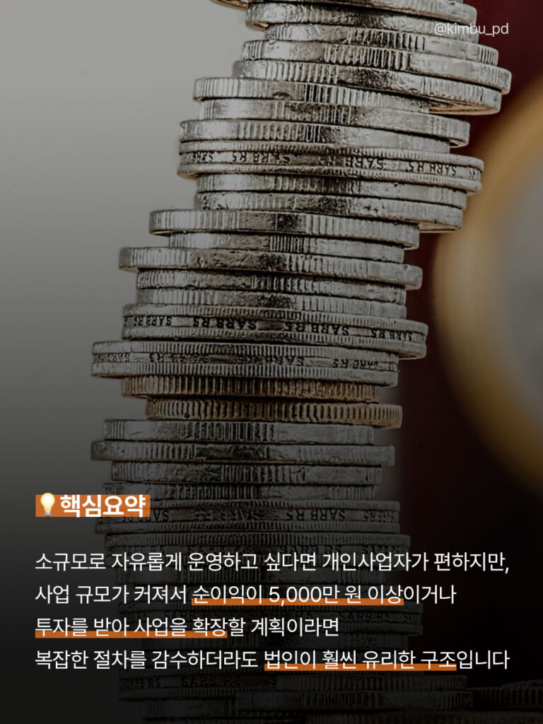 - 개인사업자: 통장의 돈이 곧 대표의 돈입니다. 생활비가 필요하면 언제든 인출해도 세무상 문제가 없습니다.