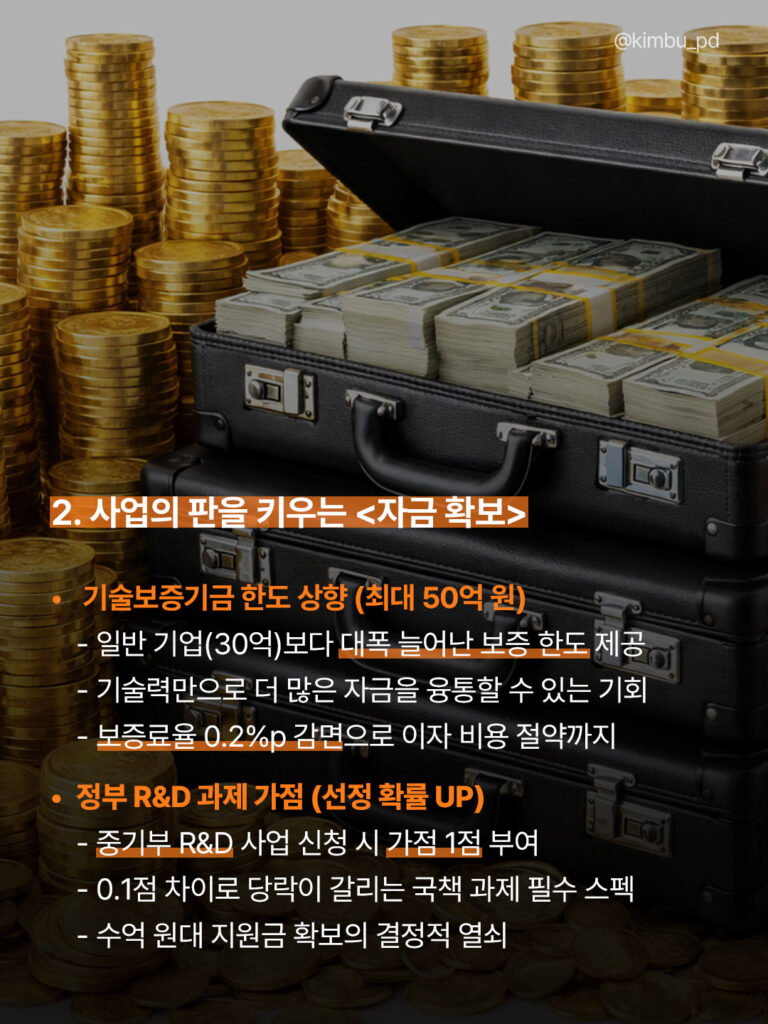 기술력은 있지만 담보가 부족한 기업에게 벤처인증은 정부가 보증하는 ‘신용장’과 같습니다. 금융권 대출 한도와 정부 R&D 사업에서 압도적인 우위를 점할 수 있습니다.