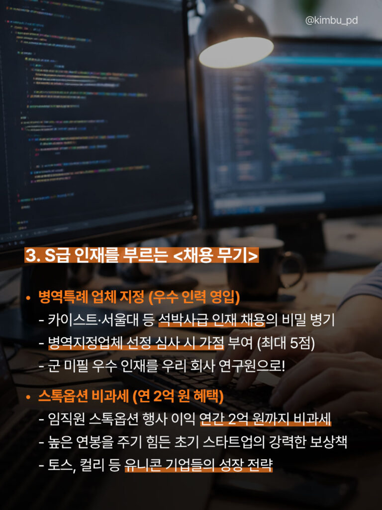 이 가점은 경쟁 기업을 제치고 ‘군 미필 우수 인재’를 우리 회사 연구원으로 채용할 수 있는 결정적인 키(Key)가 됩니다.